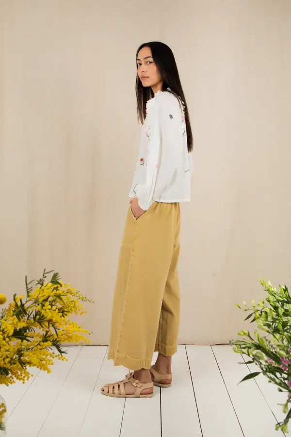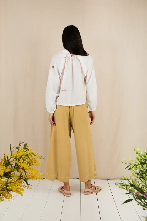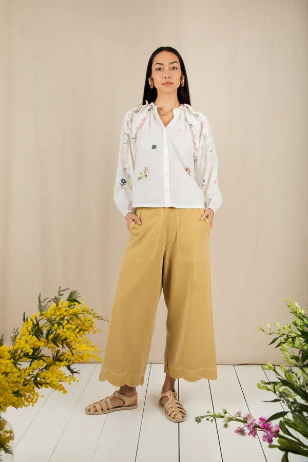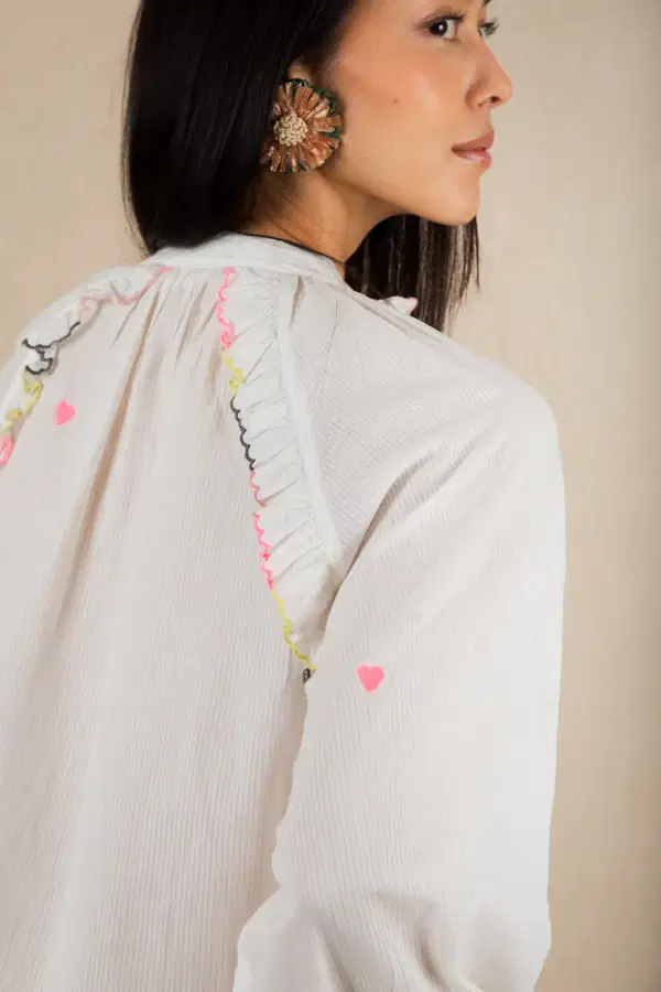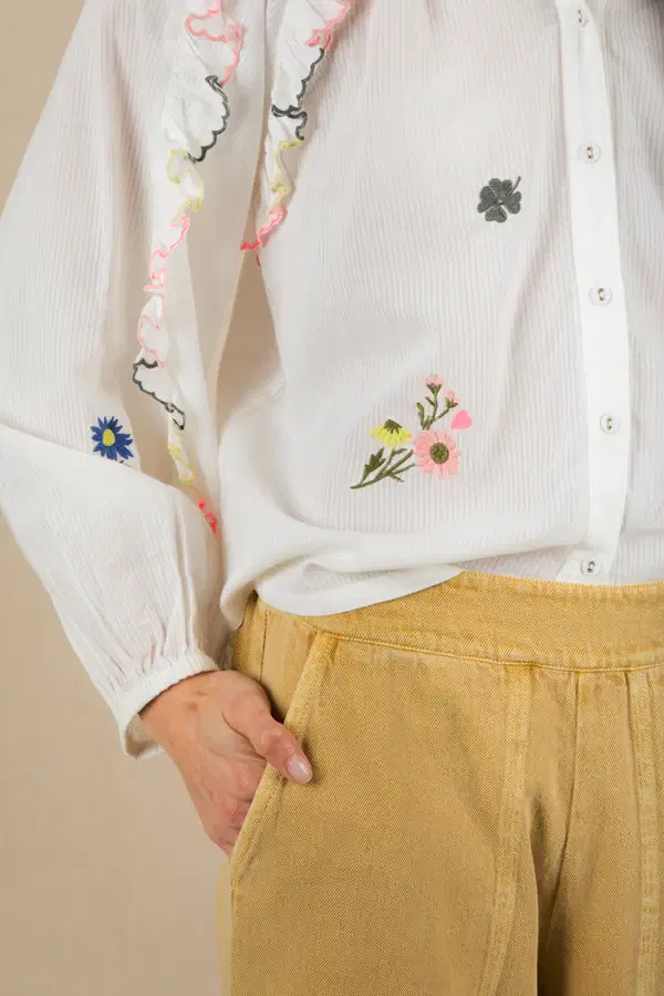 A covered button through simple stand collared shirt with a beautifully detailed placement embroidery + scallop embroidered frill detail, in an organic self stripe cotton.