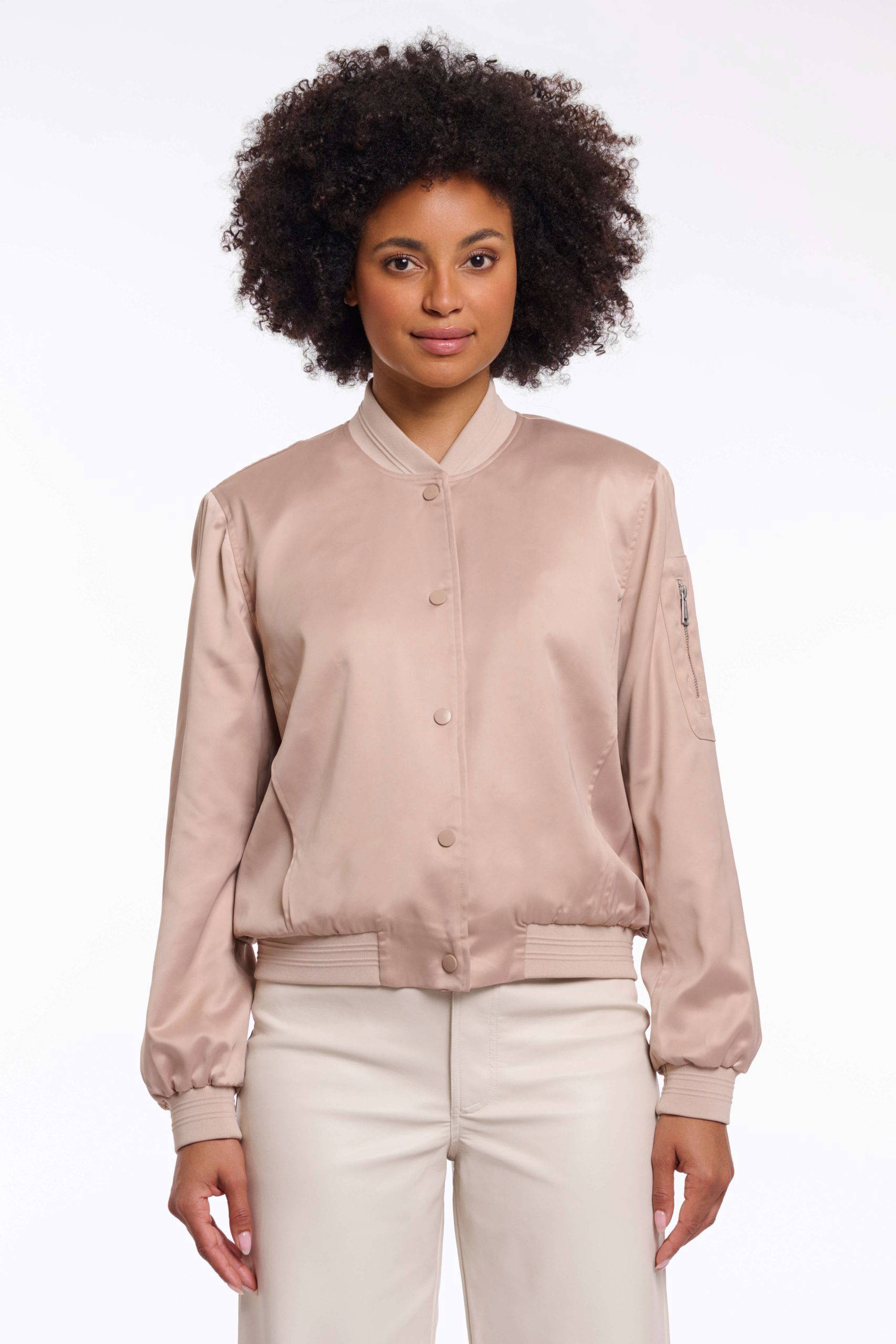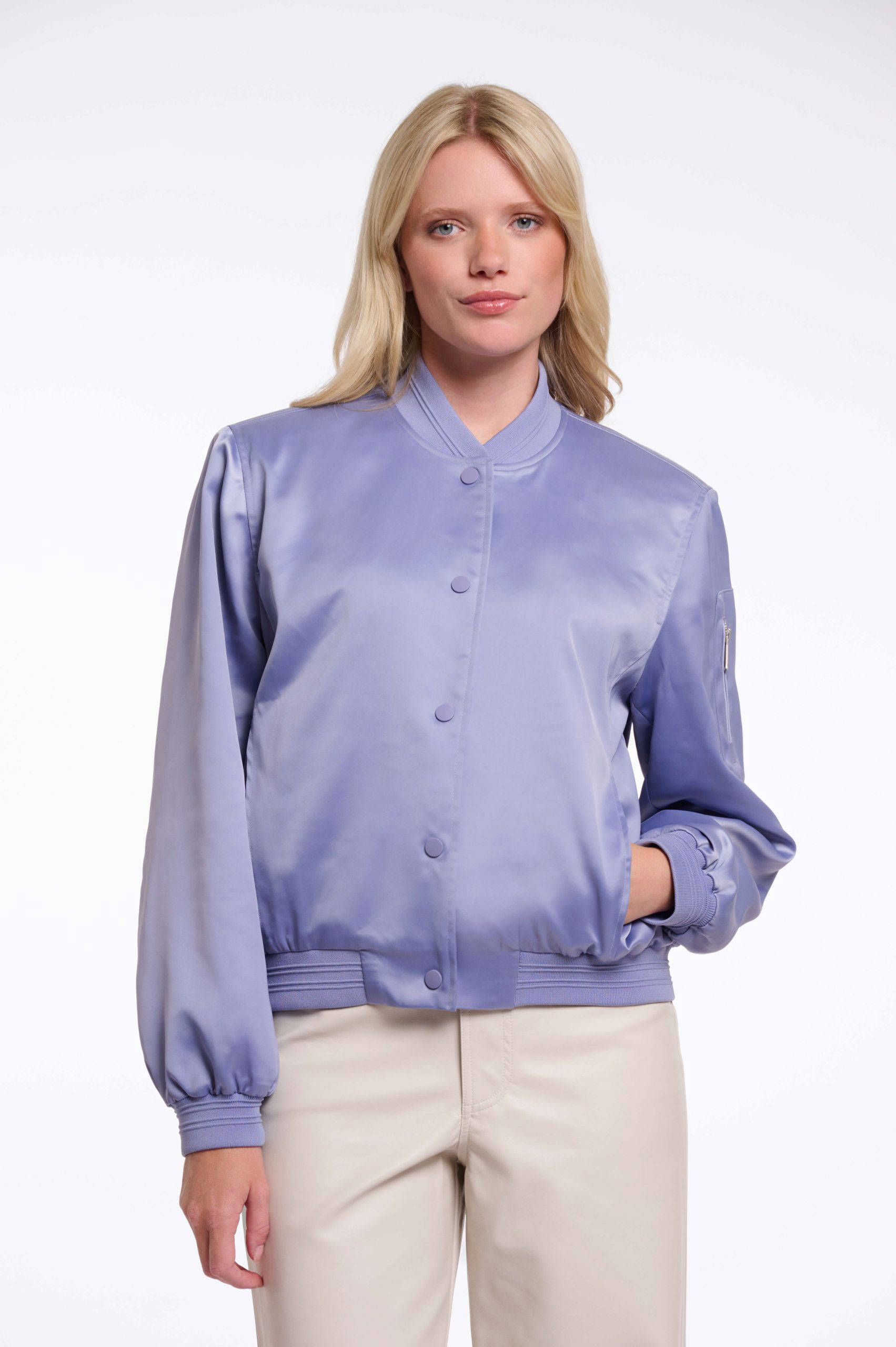A contemporary bomber crafted from a smooth, shiny fabric that catches the light with every move. Designed with a sleek press-stud closure, a zip detail on the upper sleeve, and elastic trims at the collar, cuffs, and hem for a polished finish. This all, in combination with the slightly relaxed fit makes this bomber a musthave item.