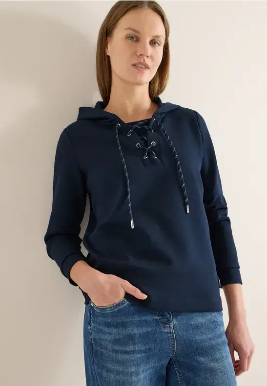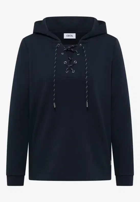 This women’s hoodie from CECIL brings a touch of nautical flair to your wardrobe. The V-neck with sporty thong details, the hood, and the stretch in the cotton blend ensure a comfortable feel and a casual look.