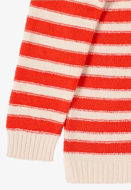 Cozy, modern, and versatile: This striped bouclé sweater from CECIL for women features a boat neck, long sleeves, and a comfortable cotton blend. Ideal for relaxed casual outfits with a touch of nautical flair