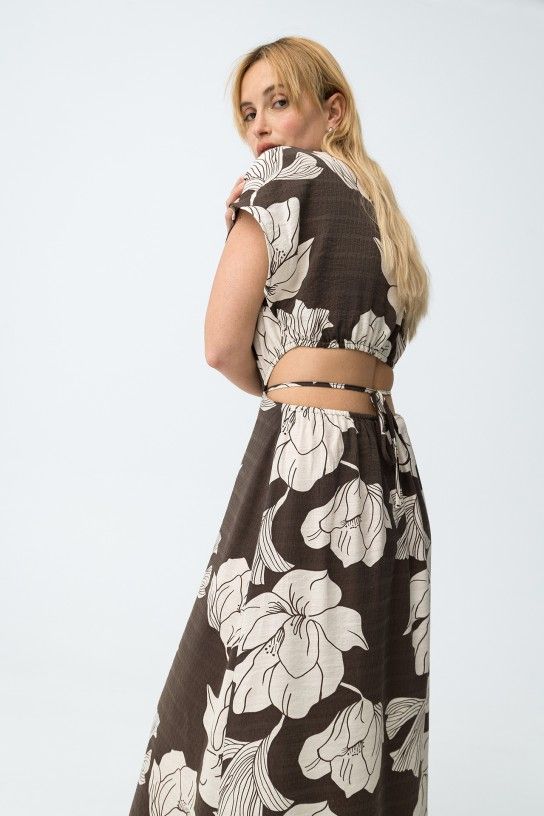Printed midi dress with cutouts at the waist. With a V-neckline and flap collar, short sleeves and button closure at the top.