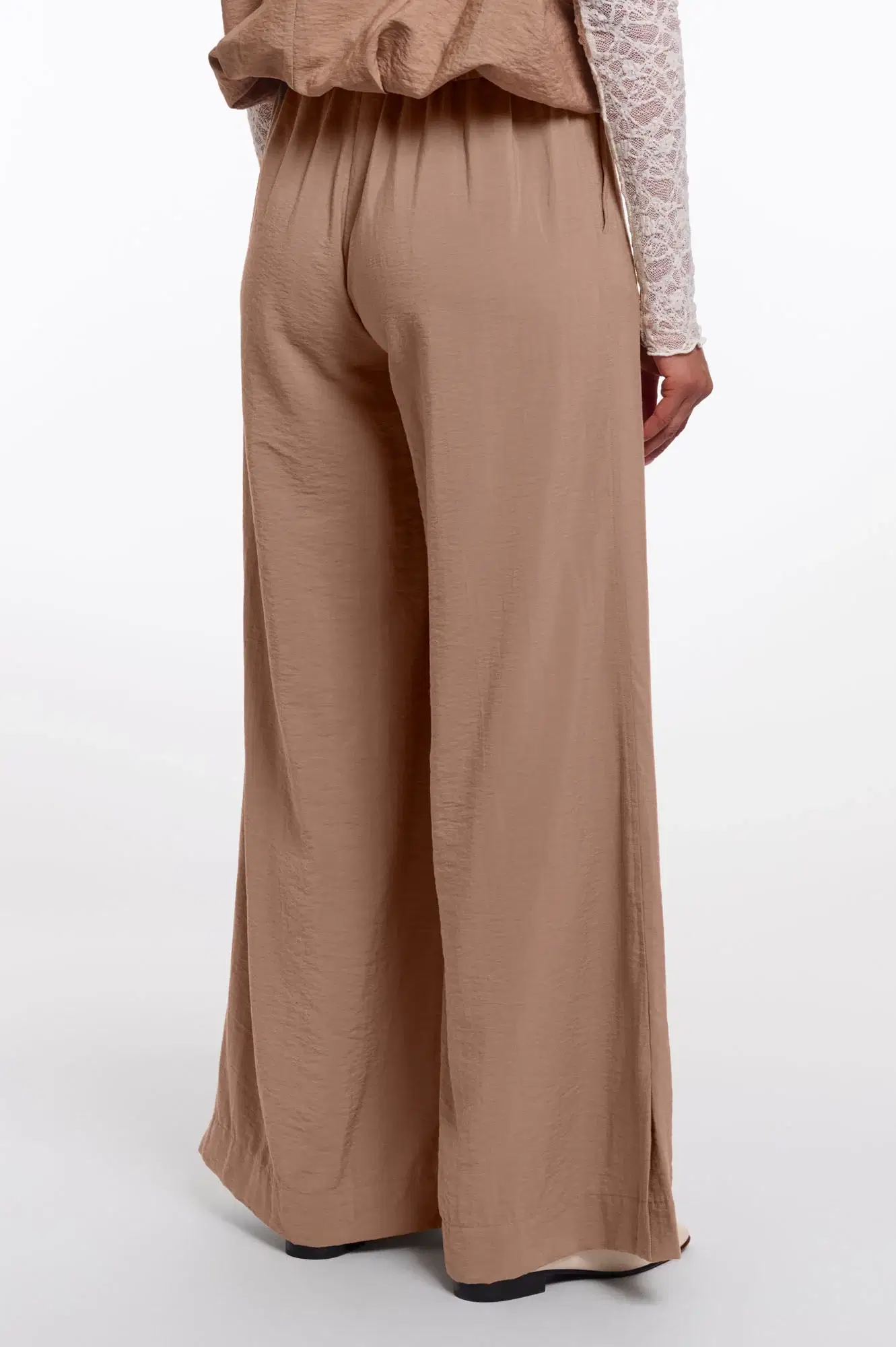 Step into effortless elegance with these wide-leg trousers, crafted from a soft, fluid fabric that moves beautifully with every step. Designed with an elasticated waistband, subtle front seam detailing, and small side slits at the hem, they offer both comfort and refined style. The elongated silhouette pairs perfectly with the Auda top for a modern, coordinated look.