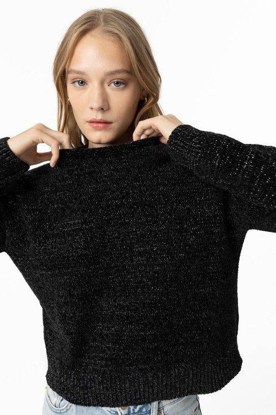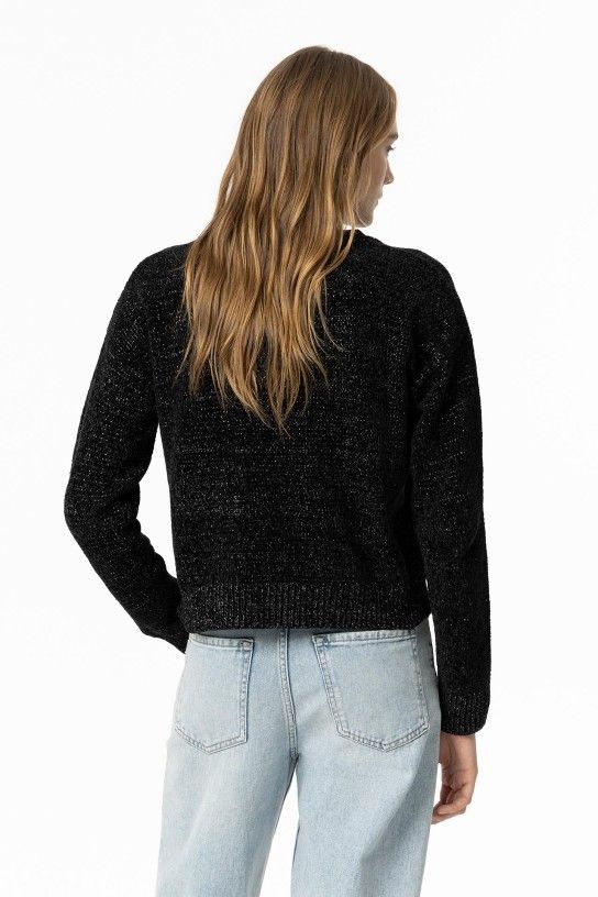 Black knit sweater with metallic thread, round neckline, long sleeves, ribbed hem.