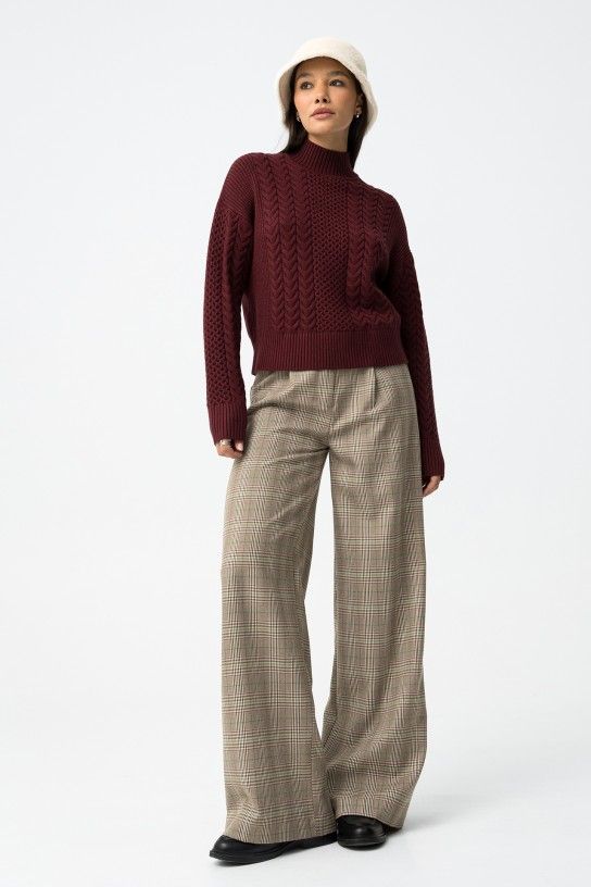 Regular fit cable knit sweater with high neck, long sleeves and ribbed finishes.
