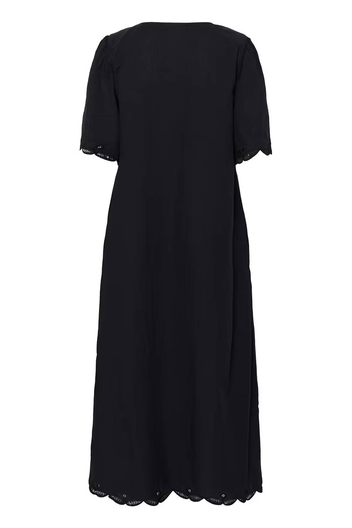 Midi dress with loose silhouette, deep V-neckline, scalloped edges and short puff sleeves. Decorative button front and eyelet trim add effortless detail to this cool, modern style.