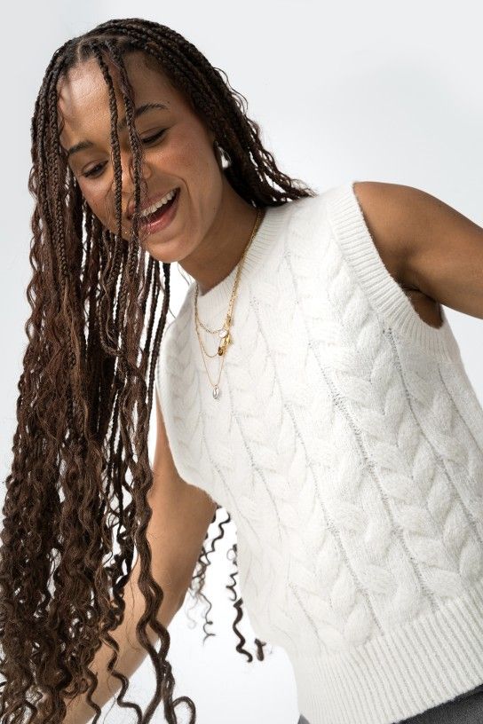 Knit vest with braided pattern. Round neckline and rib trim at neck/armholes/hem.