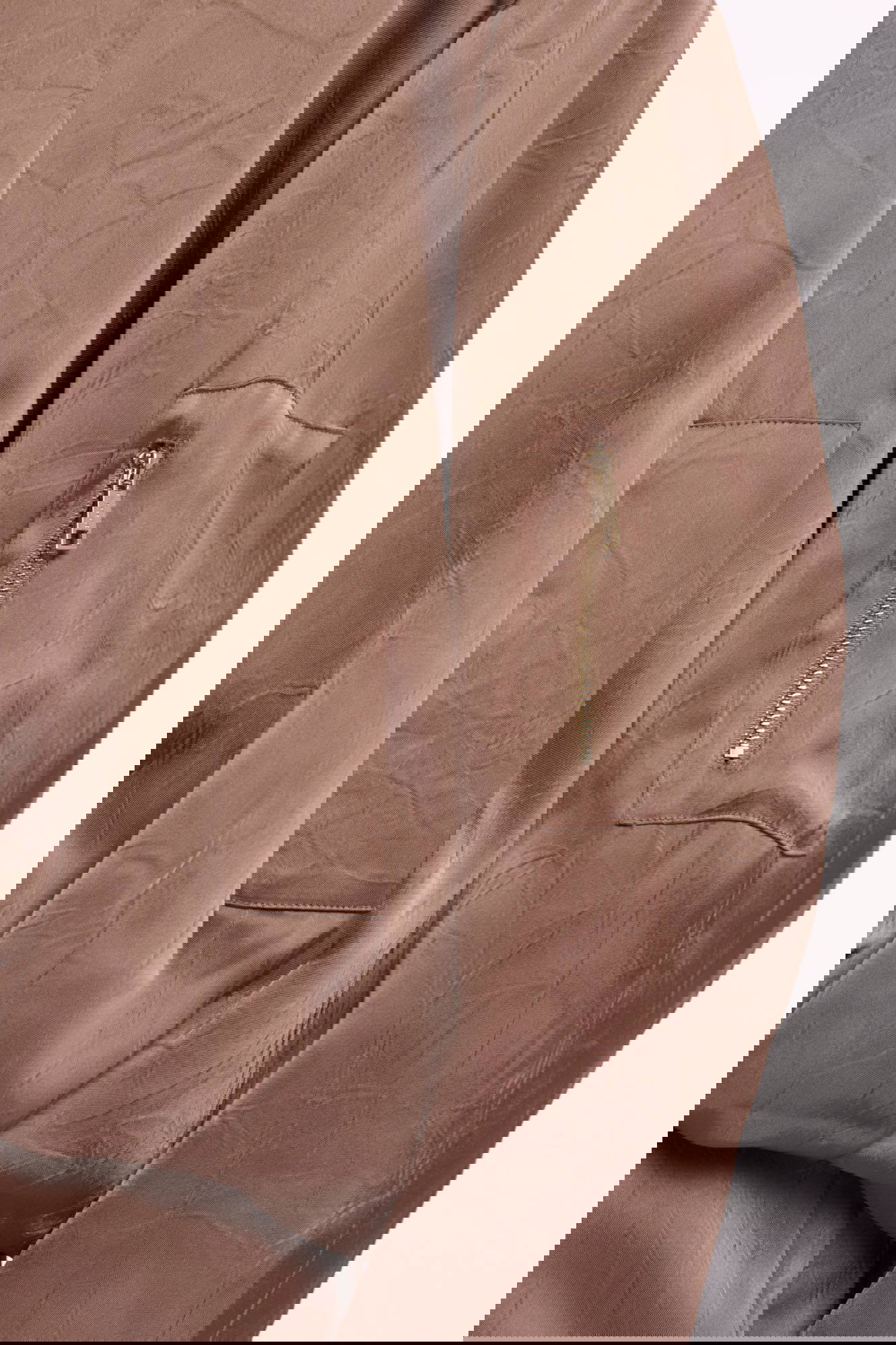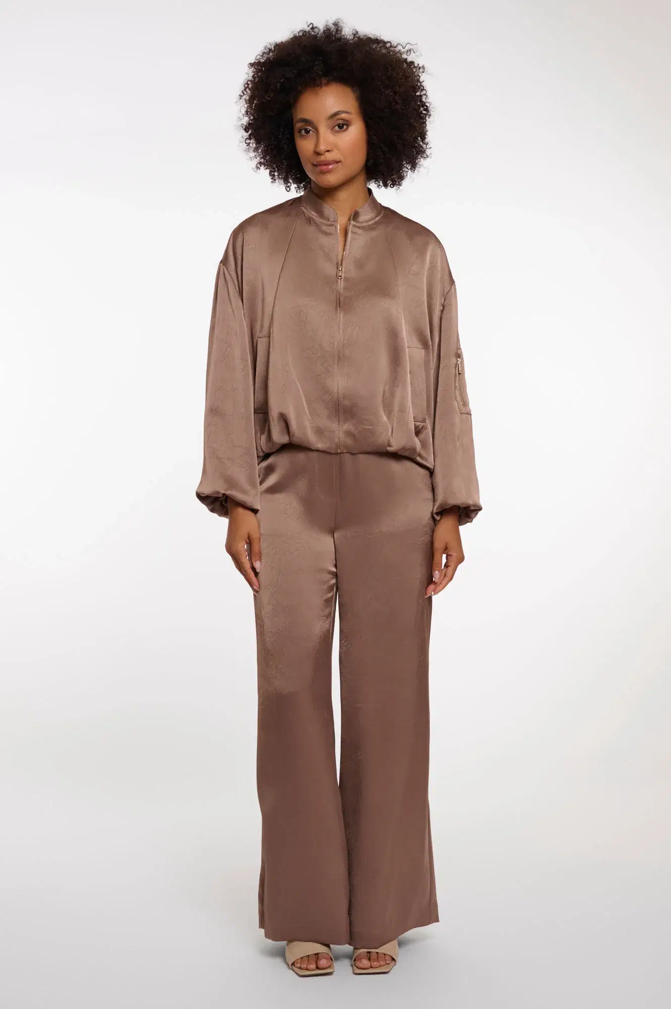 Wrap yourself in modern elegance with this satin-look bomber jacket, crafted from recycled polyester for a smooth, lightweight feel. Designed with a sleek zipper closure, discreet front pockets, and a zip detail on the sleeve, it blends refined design with effortless comfort. The elasticated cuffs, hem, and high collar create a softly voluminous silhouette, giving this shorter style a contemporary, relaxed edge.