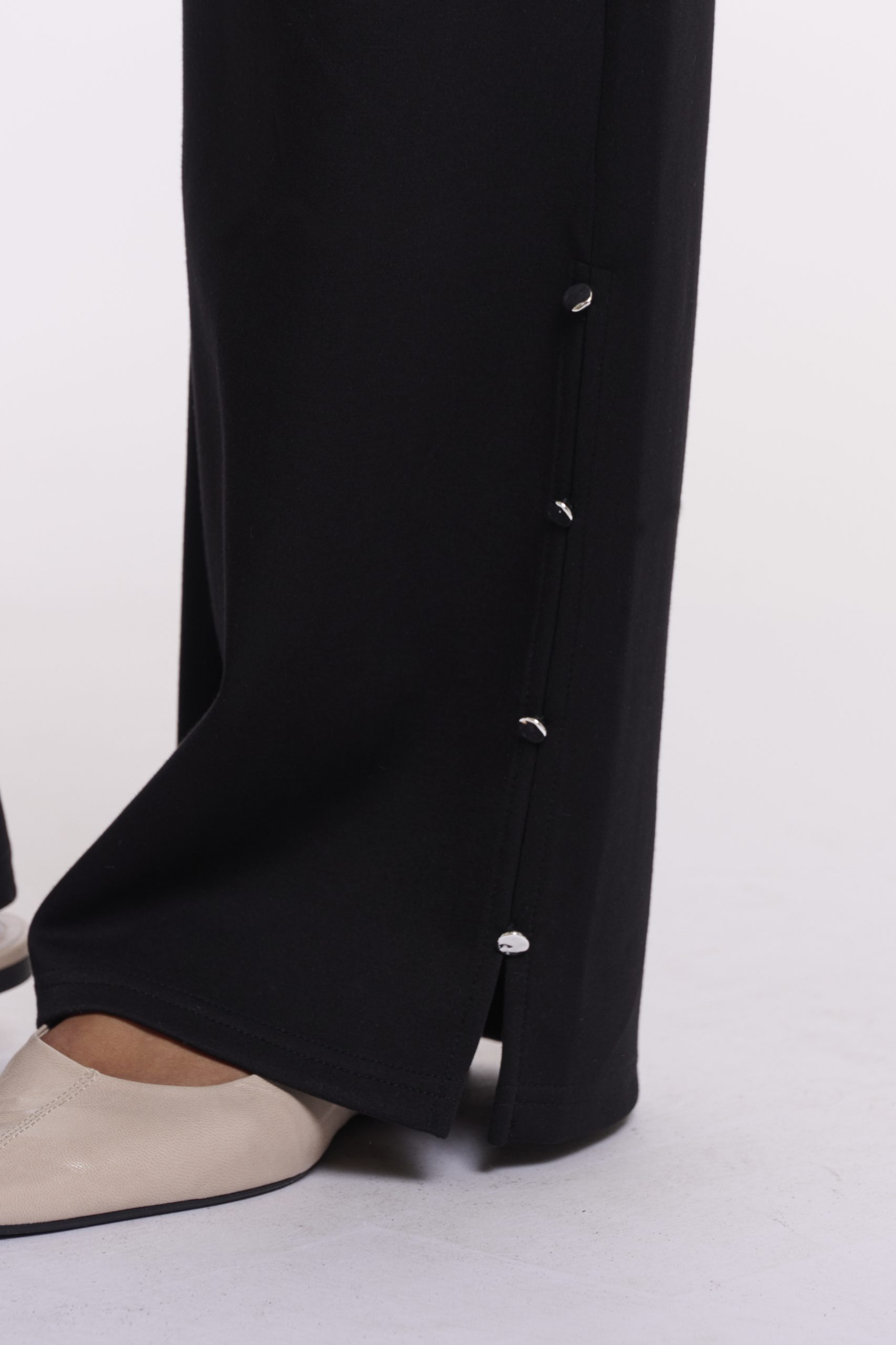 Elevate your everyday style with these airy, soft-draping trousers, designed in a relaxed straight wide-leg silhouette. Refined side slits at the hem, finished with elegant silver-tone studs, add a subtle modern touch. Discreet slip pockets complete the look, making them an effortlessly polished yet comfortable choice.