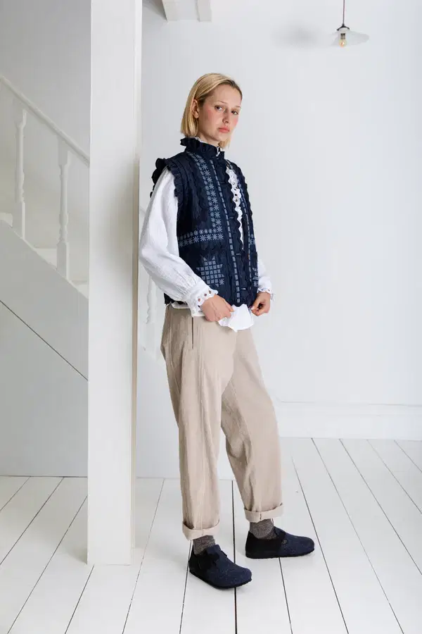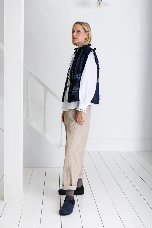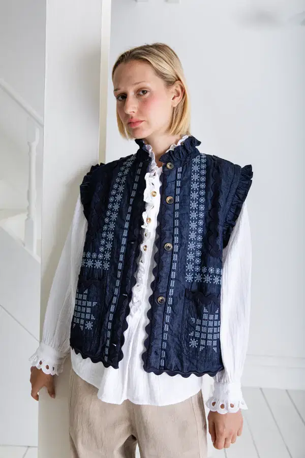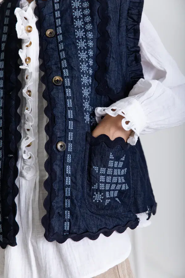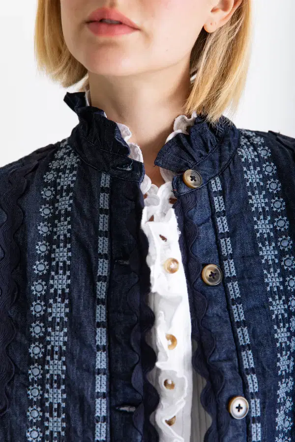 A truly artisanal Gillet in a dark-wash organic cotton denim with statement placement embroidery + ric-rac trim detail. The lining is lightly quilted in a contrast chambray and the neck and armhole feature a feminine frill detail. Contrast mock horn buttons.