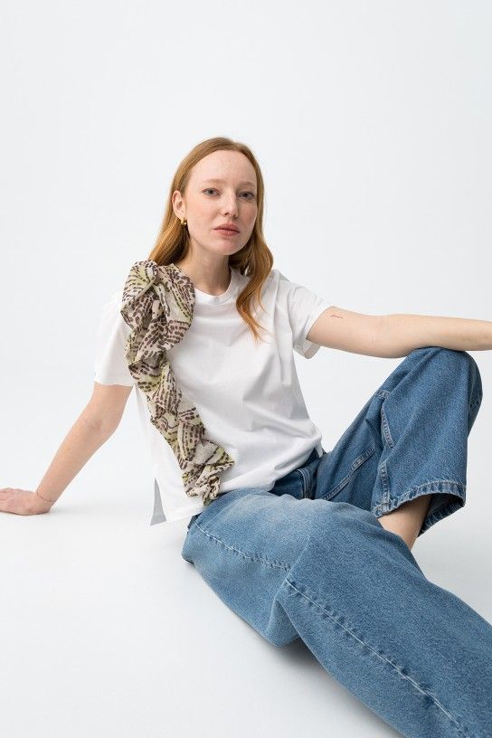 Star white straight-fit t-shirt with short sleeves, featuring a ruffled printed detail on one shoulder.