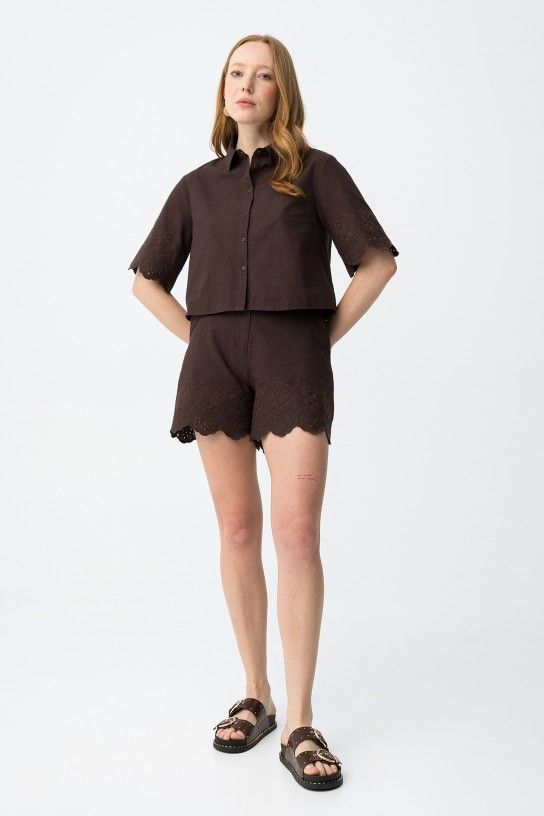 Regular fit chocolate shorts with floral embroidery and scalloped hem, relaxed vibe and side pockets.