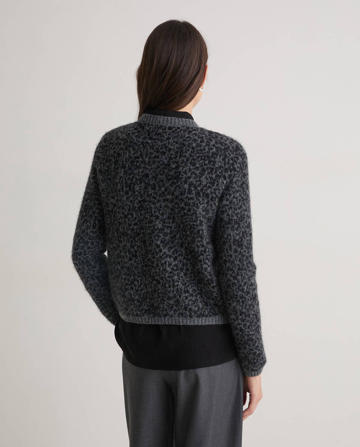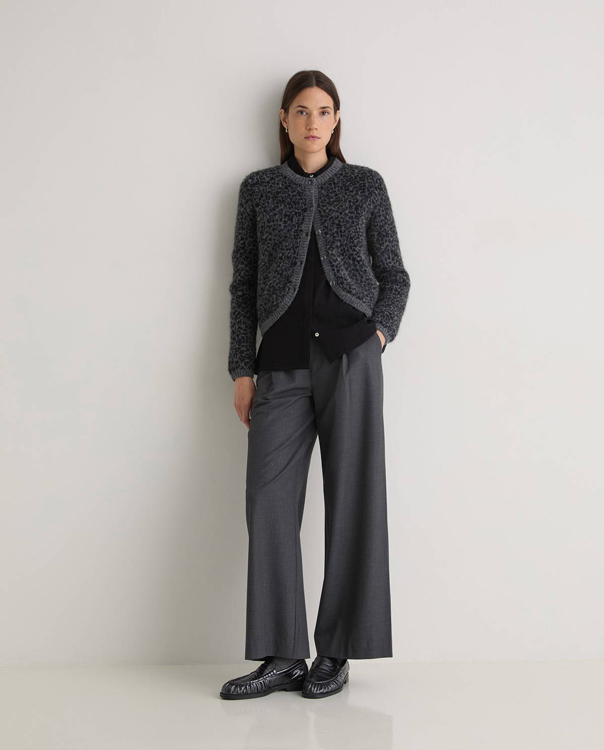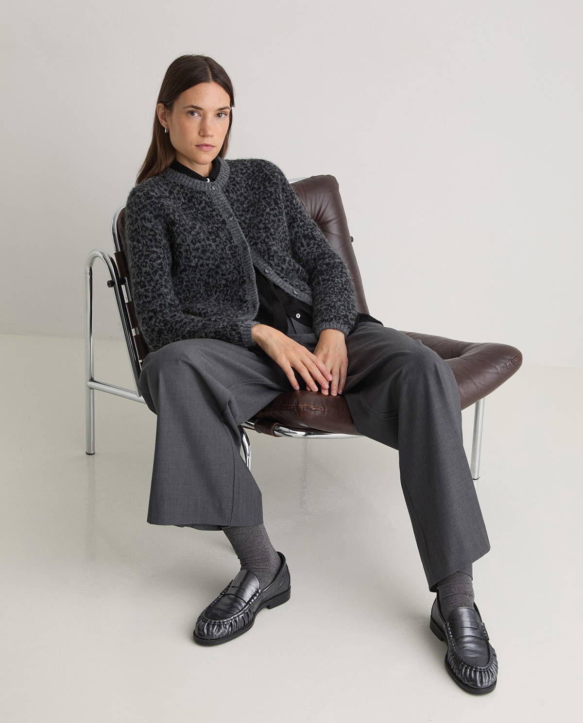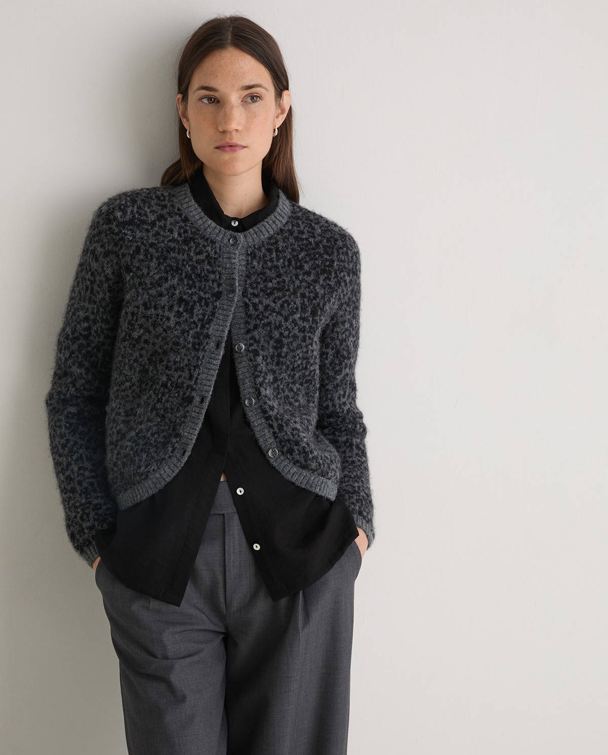 Animal-print cardigan. Wool and alpaca blend. Regular-fit with rounded front. Round neckline. Long sleeves. Button front. Contrasting ribbed accents.