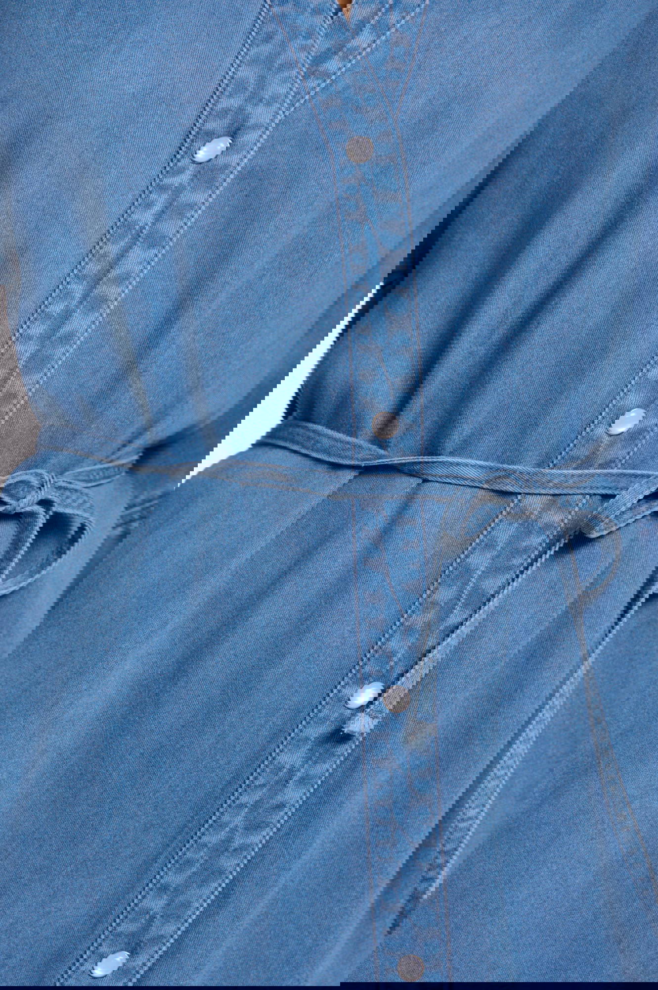 Embrace effortless elegance with this airy dress, crafted with a denim-like design that drapes softly to a refined below-the-knee length. Designed with a flattering V-neckline, a full button placket, and voluminous half balloon sleeves, it blends ease with feminine sophistication. Finished with a slim tie belt to accentuate the waist, it’s a timeless piece perfect for both elevated casual looks and chic occasions.