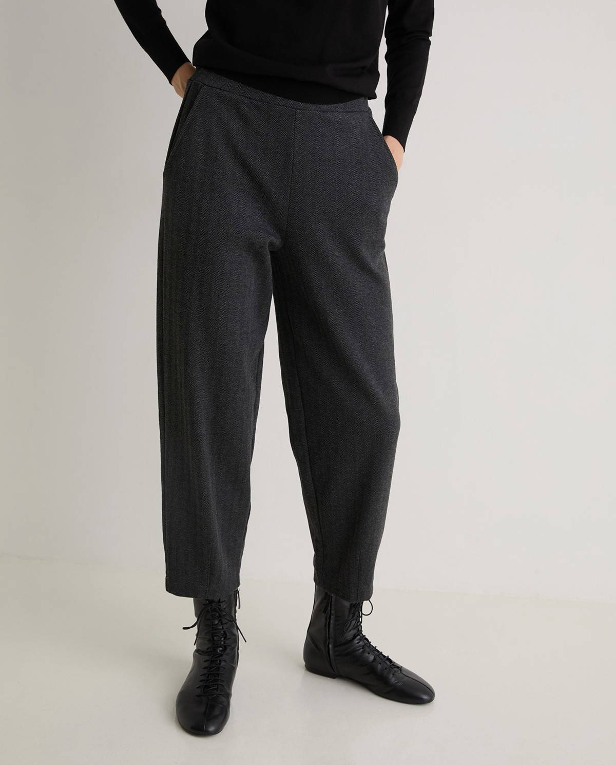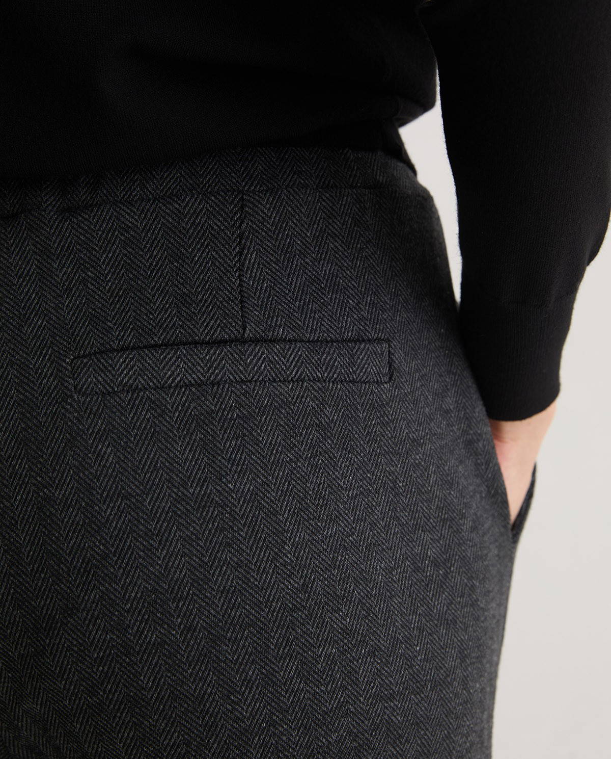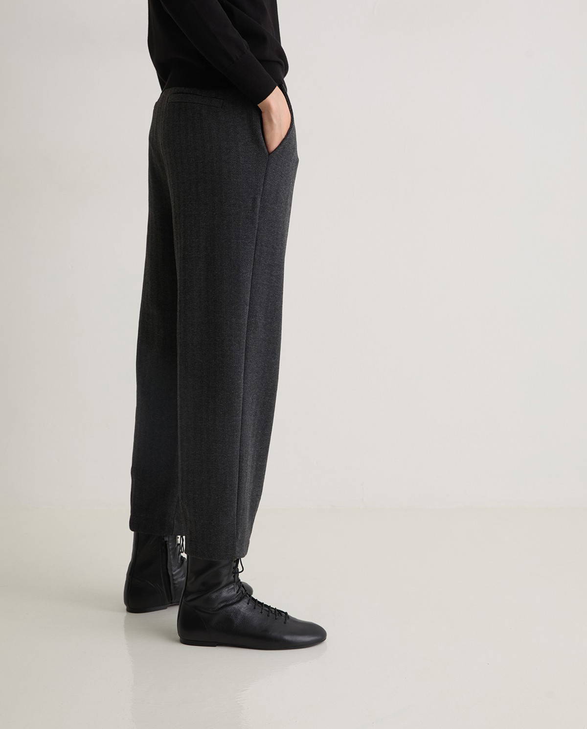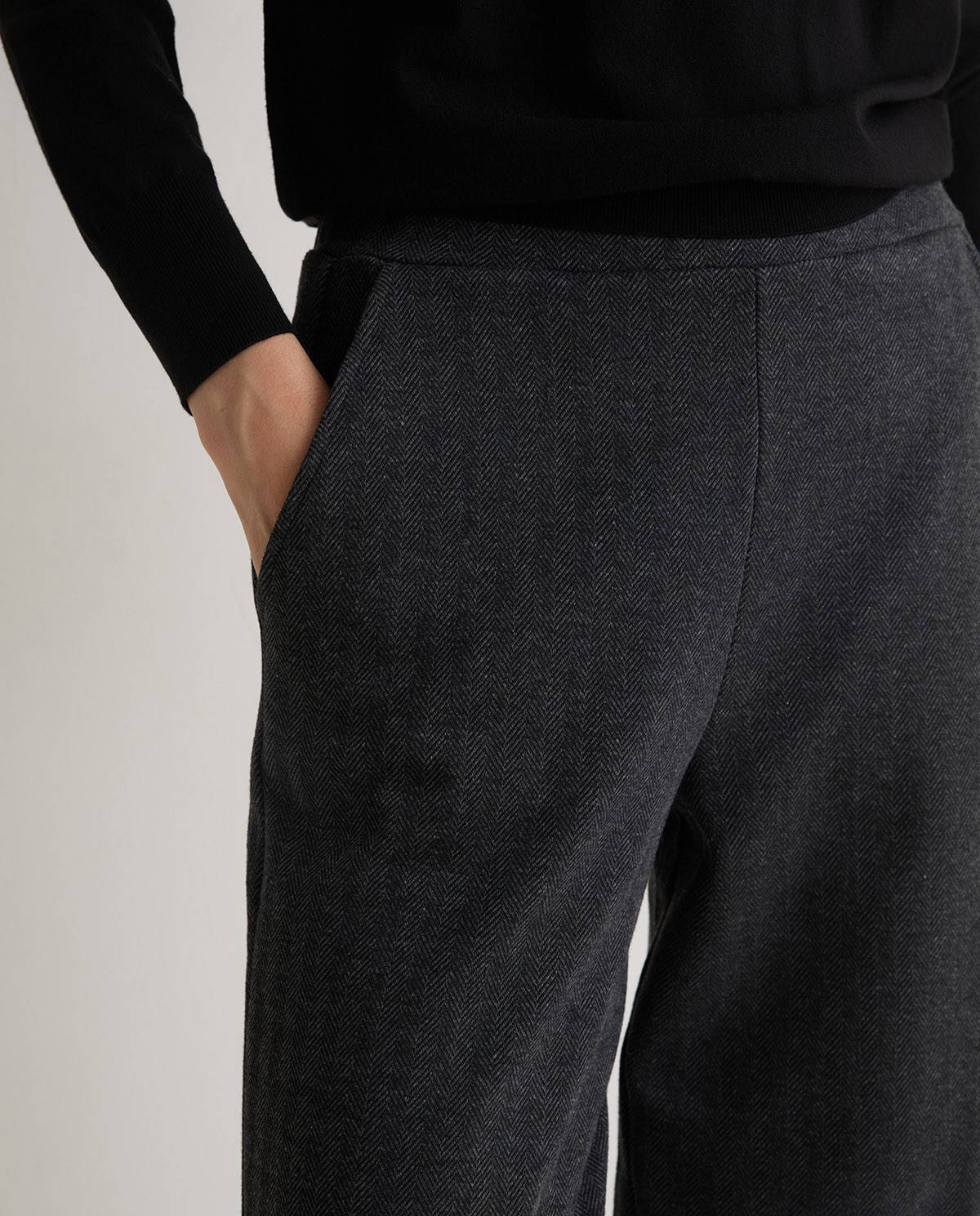 Herringbone knit trousers. Cotton and viscose blend. Wide cut. No fastening. Elastic waistband. Two side pockets and 2 back welt pockets.