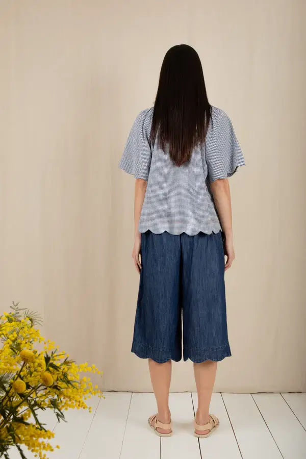 A soft, feminine round neck top with a frill + fine tie detail, is made in a mini-gingham cotton seersucker and is cut to be loose fitting + floaty.