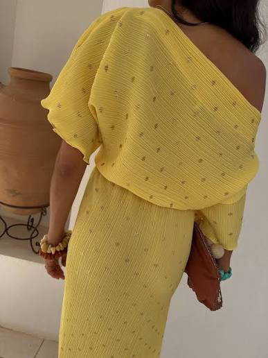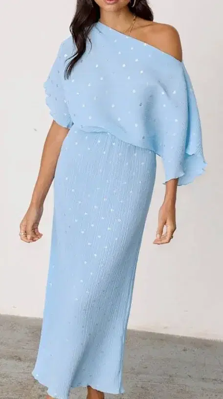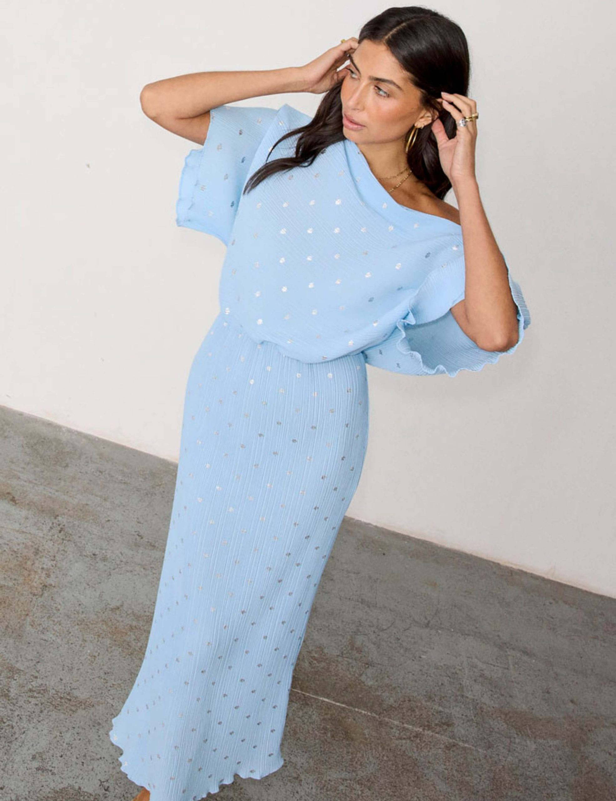 Tilly Plisse Midaxi dress is designed in a regular fit with a slightly relaxed silhouette that allows for effortless off-the-shoulder styling. The stretchy plissé fabric and elasticated waistband create a comfortable waisted shape that’s easy to wear from day to evening. A flowing midaxi length and delicate lettuce hem add an elegant ouch.