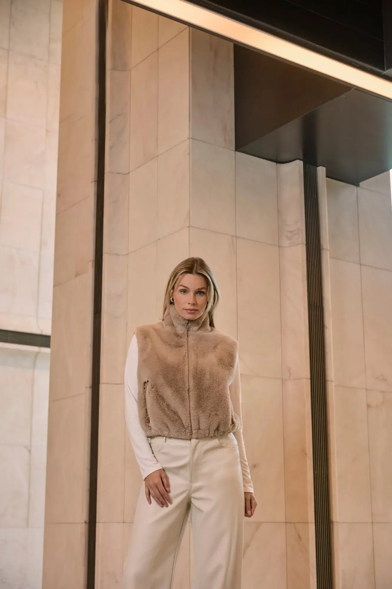 This chic waistcoat is a statement piece crafted from sumptuously soft faux-fur. The rich texture invites touch and adds warmth to any outfit. With the striking contrast created by the sleek faux leather accents. The secure zipper closure, side slits and zippered pockets make it an effortlessly stylish addition to your wardrobe.