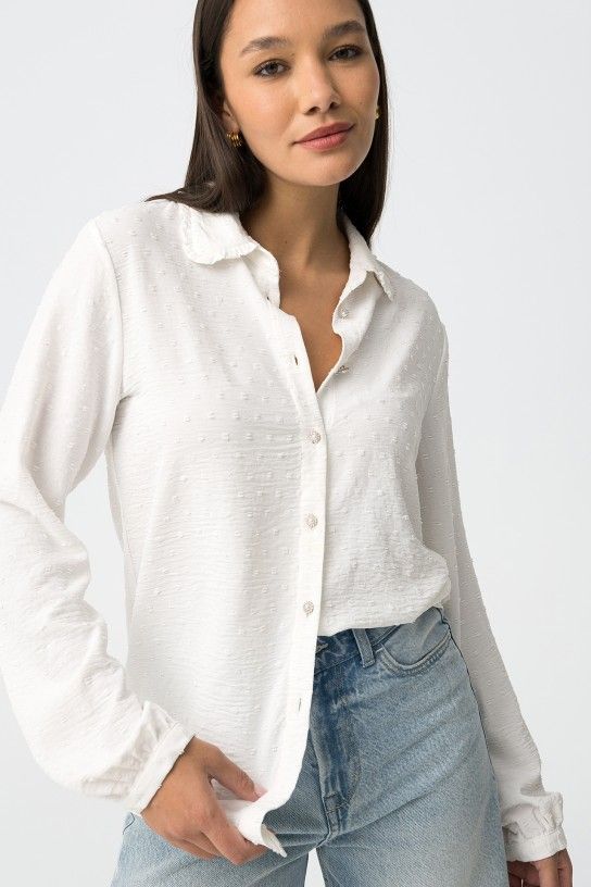 Regular fit textured shirt with jewel buttons. Peter Pan collar with ruffle, long sleeves with cuff buttons and curved hem.