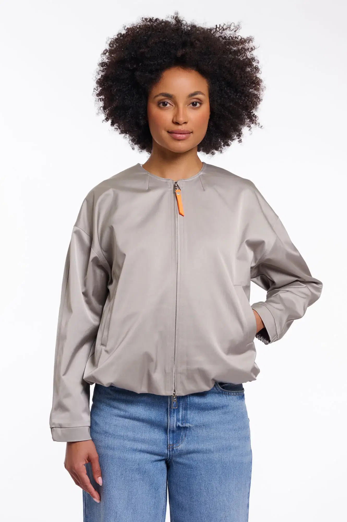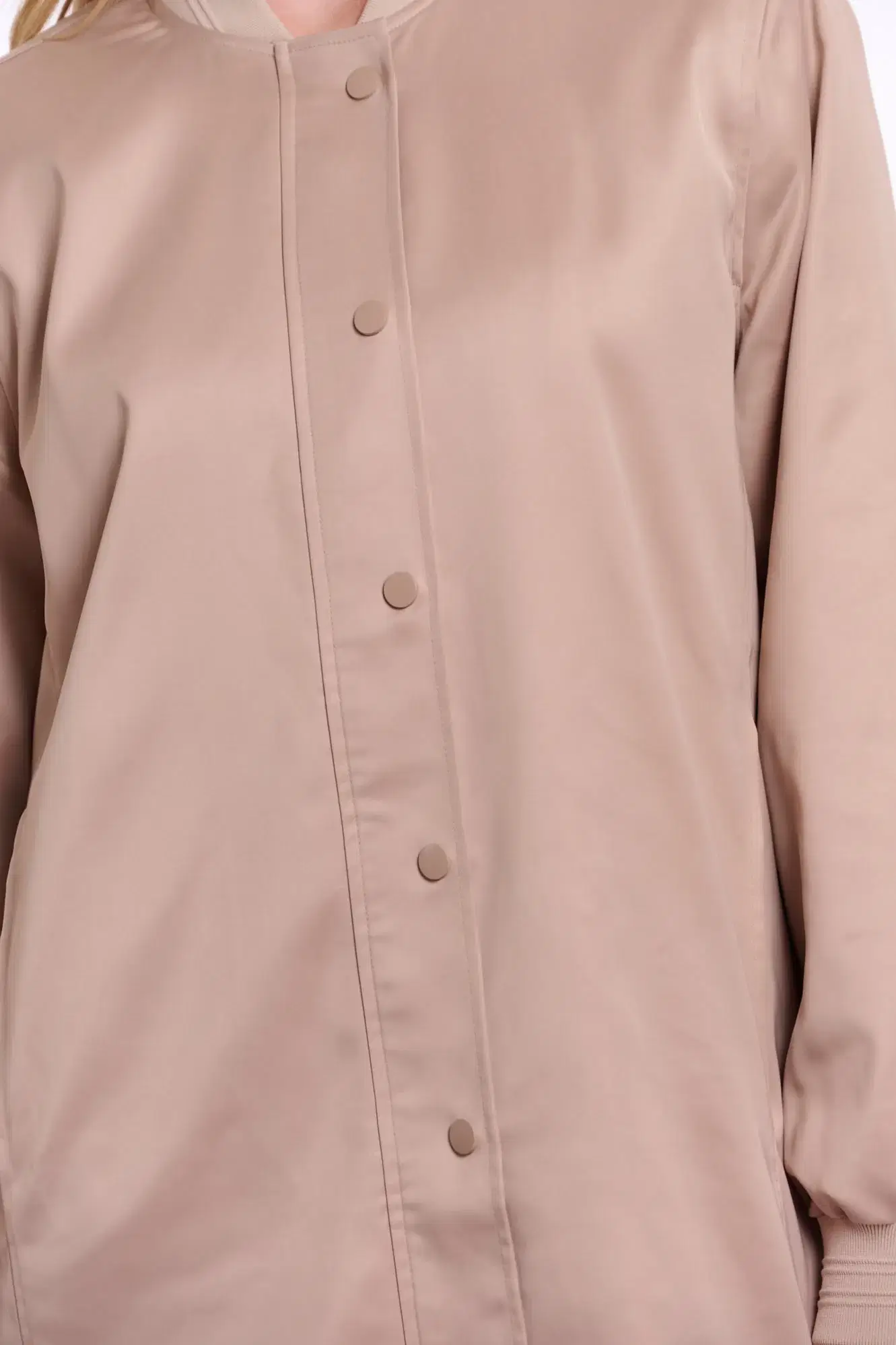 Stay effortlessly cool with this longline bomber jacket, designed with a sleek zip-and-button closure, an elasticated collar, and softly voluminous sleeves. The extended back hem features adjustable side buttons, allowing the silhouette to be worn more open or neatly tapered. Finished with elasticated cuffs and a smooth, fluid drape, it blends sporty ease with refined modern tailoring.
