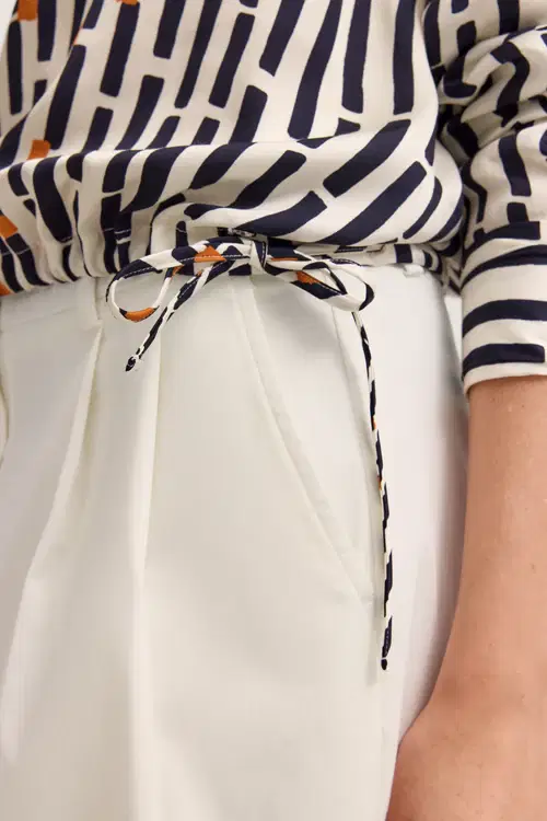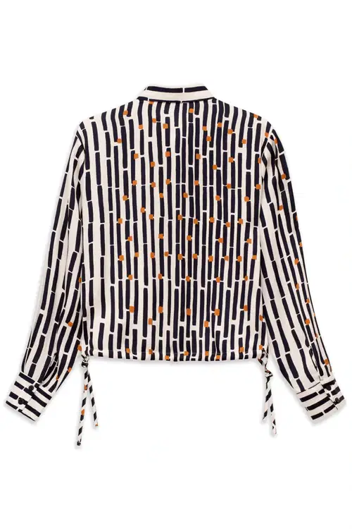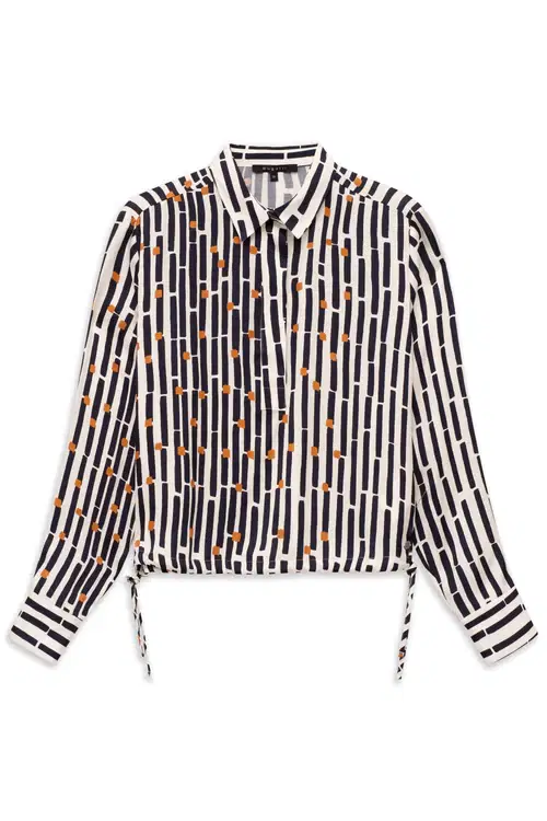 This Bugatti women’s shirt blouse in a modern fit is made from 100% viscose and impresses with its soft, flowing drape. The graphic print lends the blouse a fashionable touch, while the concealed button placket ensures an elegant look. Ties at the hem offer individual styling options. The classic shirt collar completes the design and makes the blouse a versatile companion for both leisure and the office.