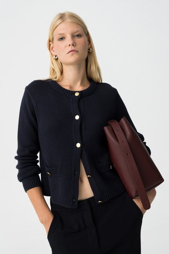 Regular fit cardigan with two decorative front pockets and metallic buttons. Round neckline and long sleeves.
