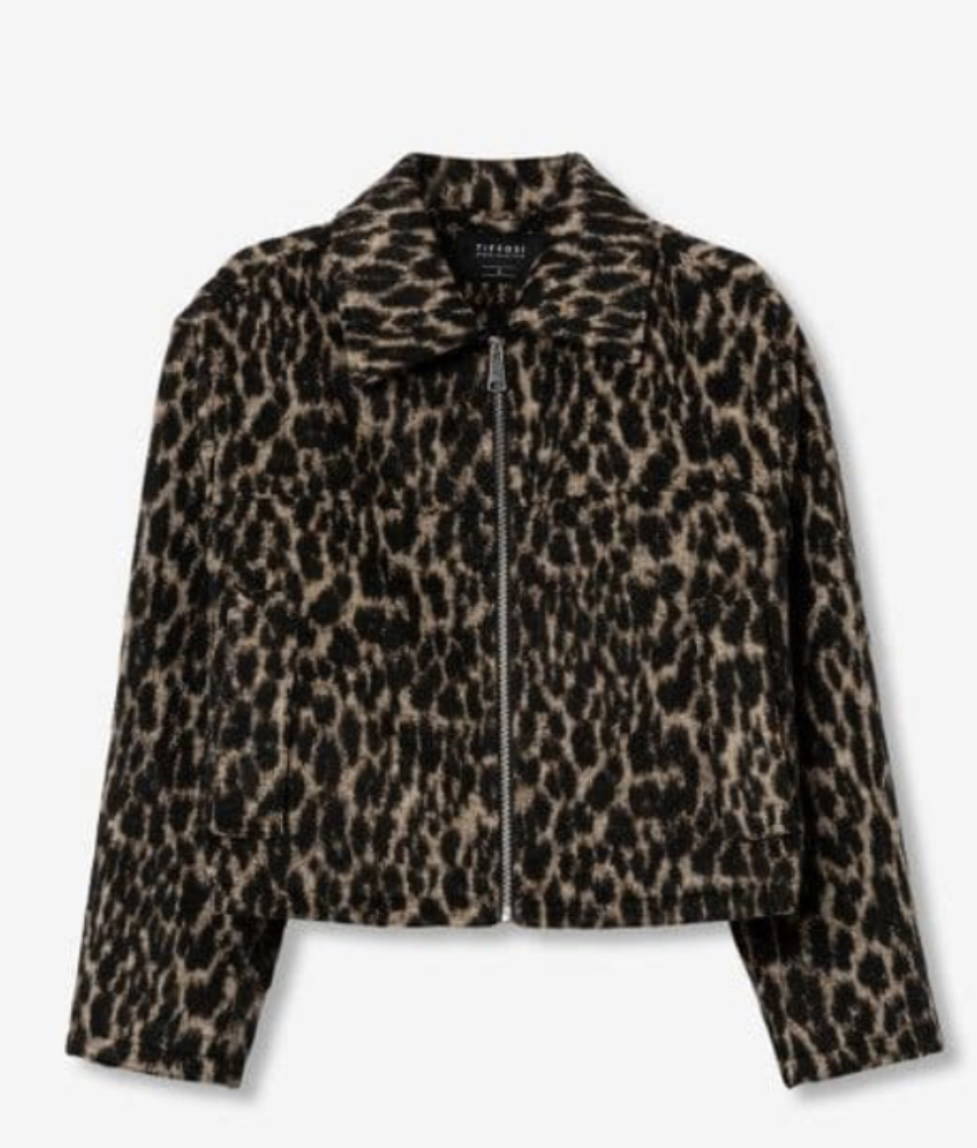 Relaxed-fit jacket with an all-over leopard print, classic lapel collar, front zipper closure, two side pockets, and long sleeves. A bold statement piece with effortless edge.