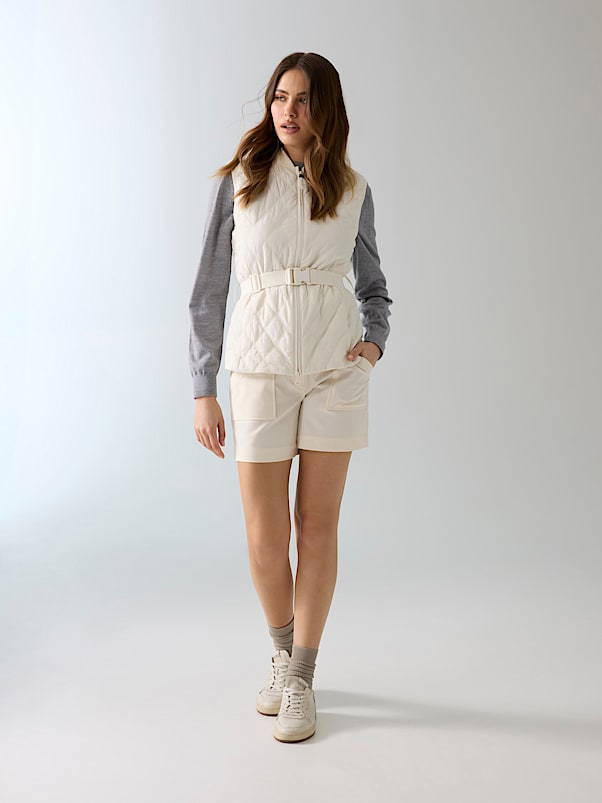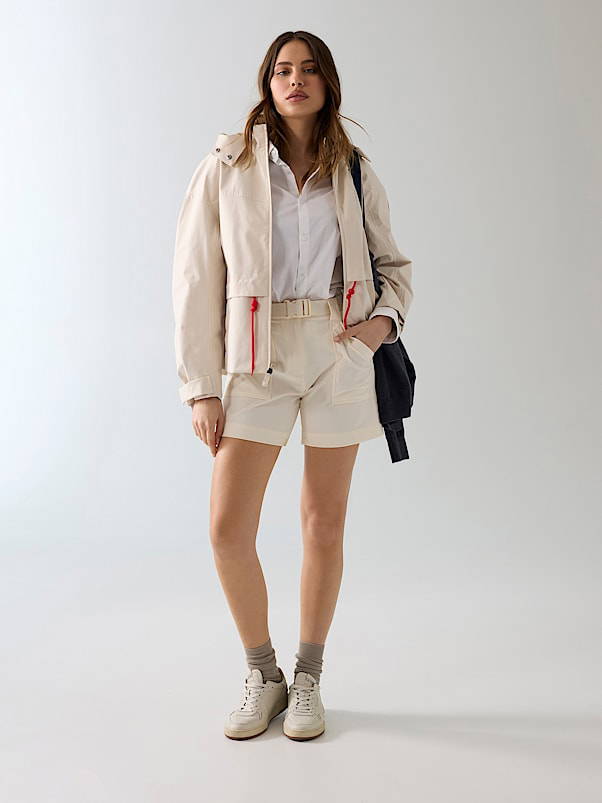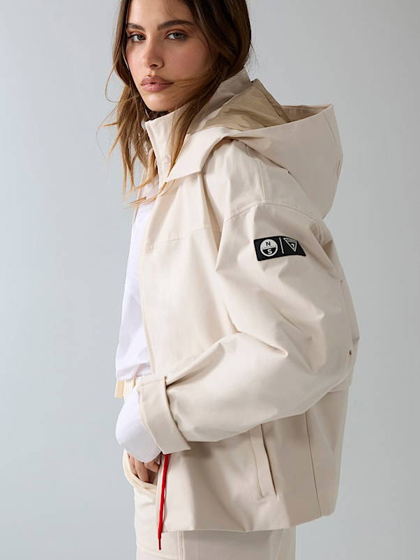 A laminated technical fabric made of three layers for waterproofing, breathability and wind protection.
