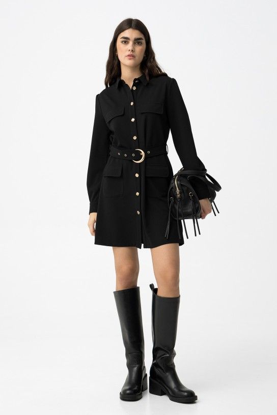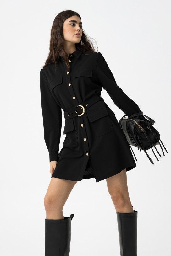 Regular fit knit shirt dress with removable belt, two pockets, decorative flaps and metal button fastening. Shirt collar, long sleeves with cuff buttons.