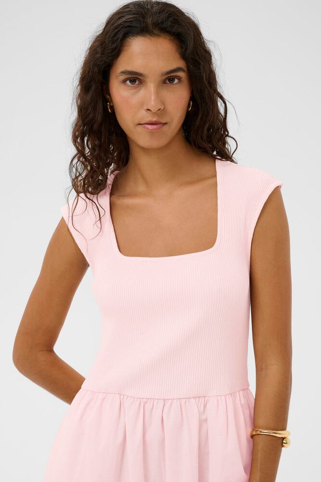 Sleeveless dress with a fitted ribbed top and woven A-line skirt. The square neckline adds a modern touch to the feminine silhouette.