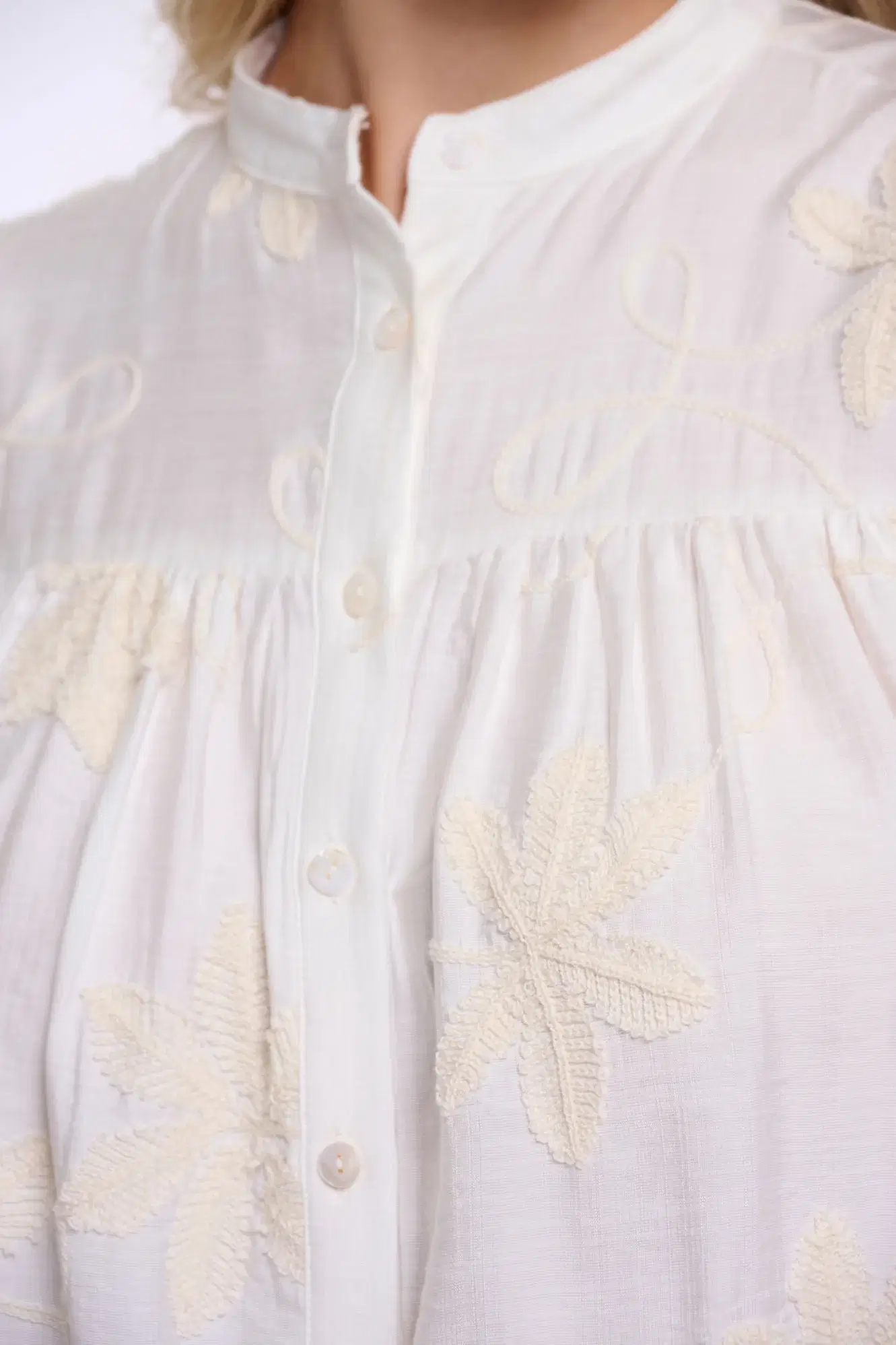 Float into effortless elegance with this airy blouse, crafted from a soft, lightweight fabric that drapes beautifully. Designed with subtle gathers above the bust, a round neckline and voluminous balloon sleeves finished with elasticated cuffs. The tonal floral embroidery adds a soft, romantic touch.